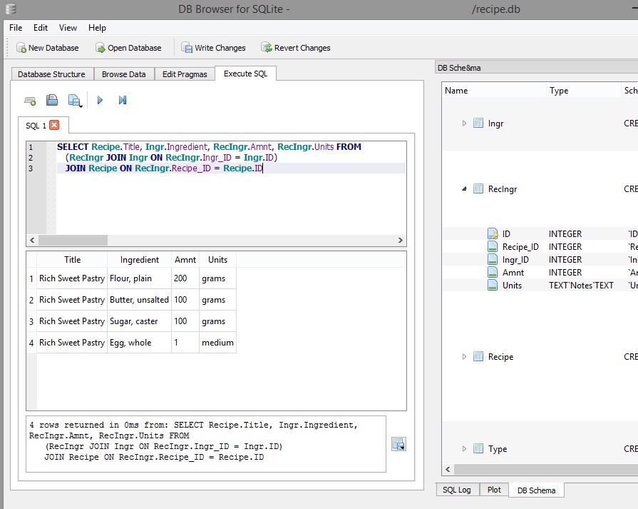 This is flawed, though, since Table: RecIngr also has a foreign key linking to the id number in Table: Ingr. The above select just returns the primary key id number from that table, whereas we want to see the ingredient itself. Firstly, to see a list of all ingredients and their attributed (ignoring recipe), we would use:
